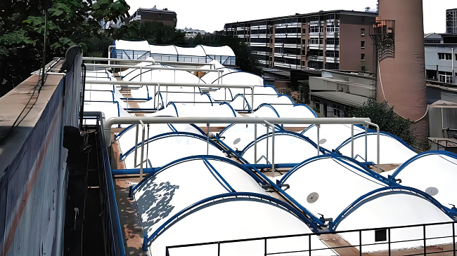 污水池加盖的作用是将有害的气体密封在污水池内的设备,污水池加盖能够有效的阻止污水池内的恶臭和有害气体散发到空气中影响空气质量和污染周围的环境,是污水处理程序中必不可少的设备。