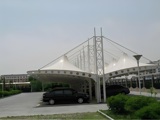 膜结构停车棚,自重轻,具有良好的受力特点——成为大跨度空间结构的主要形式之一。停车场的规划和建设成为现代城市规划的重要组成部分,在以后的建设里会变得越来越重要。膜结构轻巧、别致的造型在停车场及候车厅的建设中担当了重要角色,除了满足防风雨、防日晒等基本功能外,并有较好的标识招揽效果,展现了人们个性化的一面。