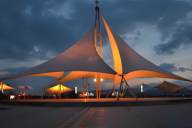 (3)经济性。膜材料具有一定的透光率,白天可减少照明强度和时间,节约能源;夜间彩灯透射可形成绚烂的景观。而且,膜结构能够拆卸,易于搬迁,特别是在建造短期应用的大跨度建筑时,更为经济。