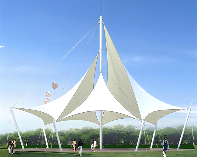 (1)大跨度。膜结构自重轻、抗震性能好,可以不需要内部支承,克服了传统结构在大跨度(无支撑)建筑上实现所遇到的困难,可创造巨大的无遮挡可视空间,有效增加空间使用面积。
