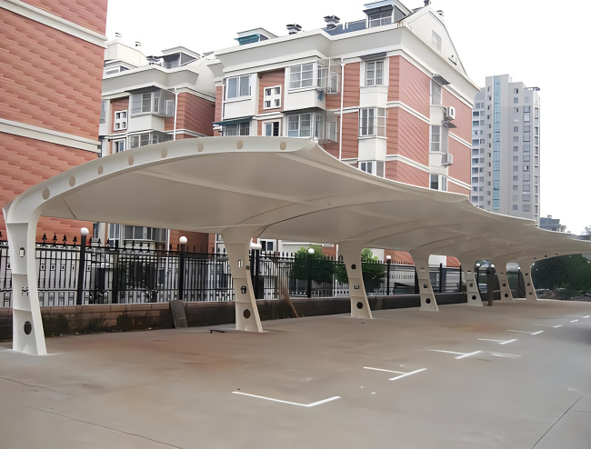 膜结构停车棚,自重轻,具有良好的受力特点——成为大跨度空间结构的主要形式之一。停车场的规划和建设成为现代城市规划的重要组成部分,在以后的建设里会变得越来越重要。膜结构轻巧、别致的造型在停车场及候车厅的建设中担当了重要角色,除了满足防风雨、防日晒等基本功能外,并有较好的标识招揽效果,展现了人们个性化的一面。