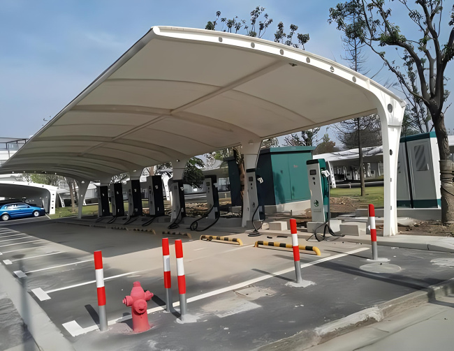 膜结构停车棚,自重轻,具有良好的受力特点——成为大跨度空间结构的主要形式之一。停车场的规划和建设成为现代城市规划的重要组成部分,在以后的建设里会变得越来越重要。膜结构轻巧、别致的造型在停车场及候车厅的建设中担当了重要角色,除了满足防风雨、防日晒等基本功能外,并有较好的标识招揽效果,展现了人们个性化的一面。